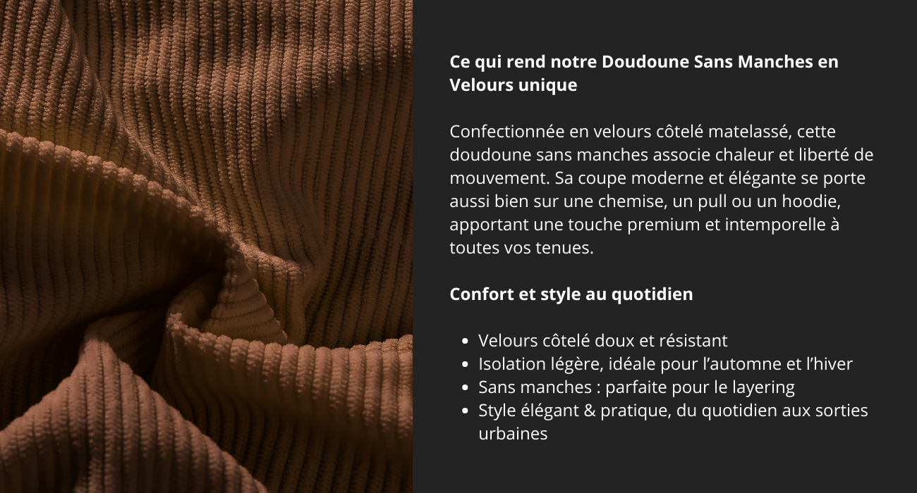 Doudoune sans manches en velours côtelé matelassé, dotée d’un col montant et d’une fermeture zippée. Une pièce polyvalente et moderne, pensée pour compléter vos looks tout en garantissant chaleur et confort.