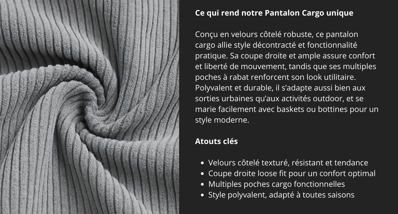 Un pantalon cargo revisité en version velours côtelé, alliant confort et praticité. Sa coupe droite et ample met en valeur toutes les morphologies tout en assurant une liberté de mouvement optimale. Ses poches cargo à rabat renforcent son côté utilitaire et tendance, faisant de ce pantalon une pièce maîtresse pour un style à la fois moderne et fonctionnel.