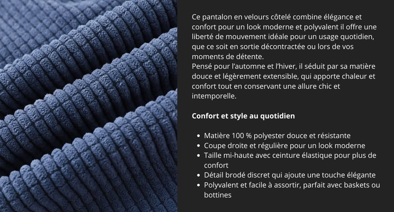 Alliant modernité et confort, ce pantalon en velours côtelé est un indispensable pour vos tenues d’automne et d’hiver. Sa matière légèrement extensible épouse les mouvements, tandis que sa coupe droite assure un style décontracté mais soigné. Avec son détail brodé et sa taille élastiquée, il se porte facilement au quotidien.