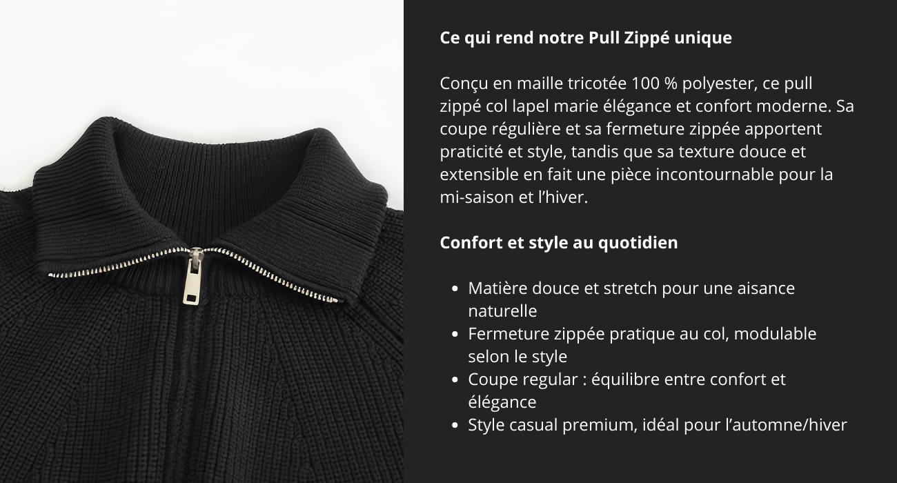 Pull en maille tricotée, col lapel zippé et coupe regular. Sa texture medium stretch assure confort et maintien, parfait pour un look casual chic.