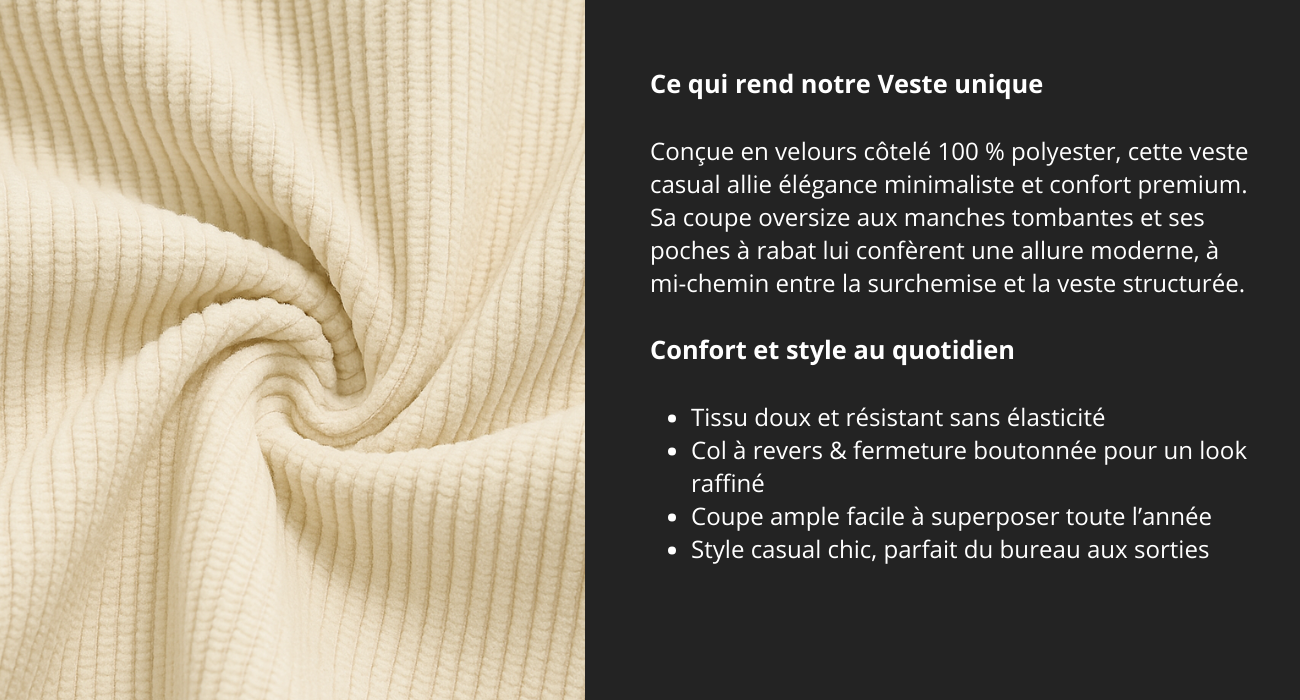 Veste femme en velours côtelé polyester, col à revers, manches longues et coupe décontractée. Boutonnage simple et poches à rabat pratiques. Pièce casual chic idéale pour toutes les saisons.